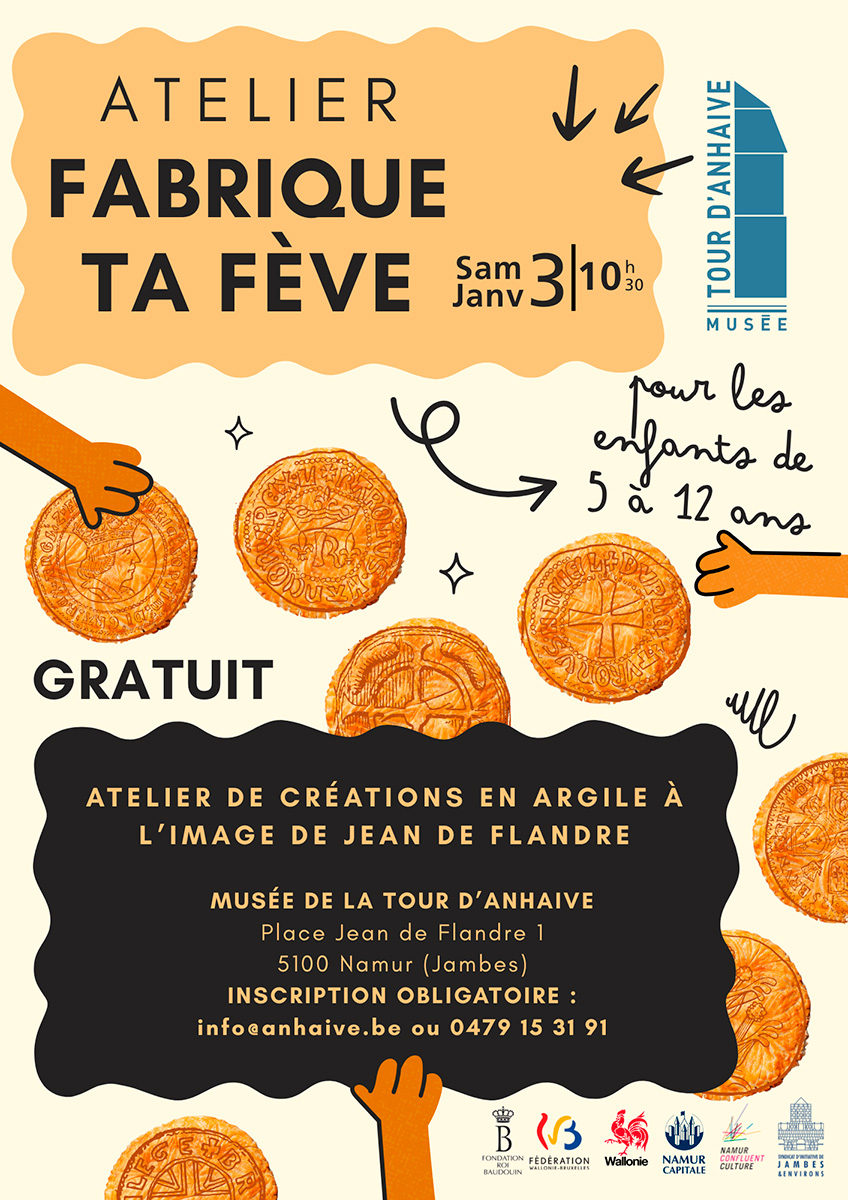 Pour débuter la nouvelle année, l’équipe du Musée invite les enfants entre 5 et 12 ans ainsi que leurs parents à venir réaliser une fève personnalisée au Musée de la Tour d’Anhaive. L’atelier se tiendra ce 3 janvier 2026 de 10h30 à 12h30. Il est gratuit, mais l’inscription est obligatoire (par mail à info@anhaive.be ou par téléphone au 0479/15.31.91).
