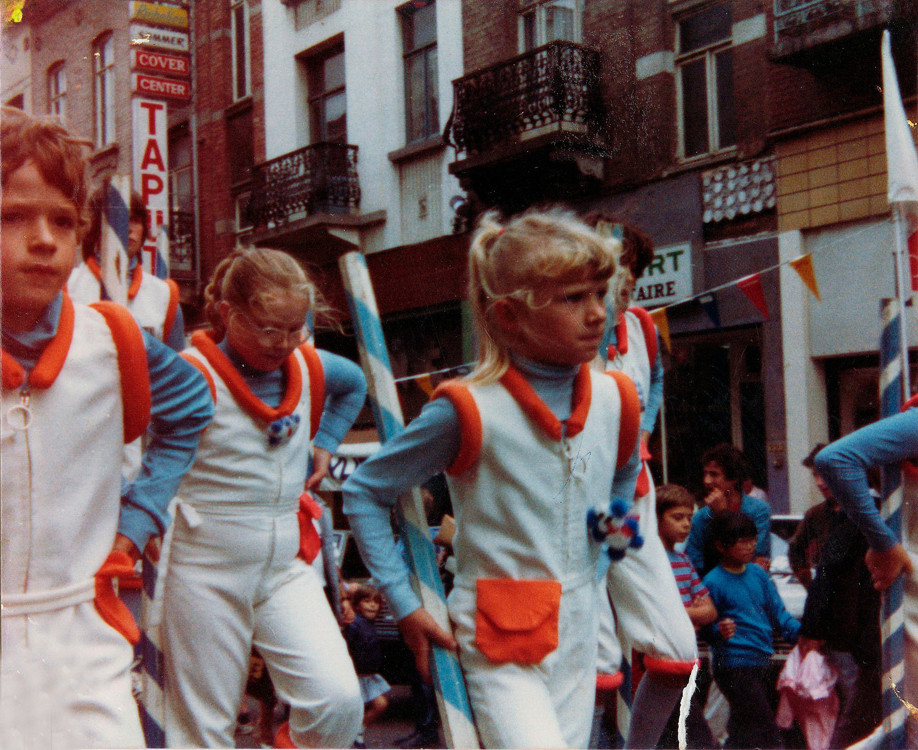Il fallait trouver un costume à notre groupe! Cette mission fut confiée à un artiste jambois, et ce n’est autre que Gilbert Laloux (le frère de Francis Laloux, qui fut Échevin du Tourisme, de la Culture et des fêtes). Gilbert en dessina le design avec toujours le BLEU et le BLANC comme base, souligné par un gros cordon orange au cou, aux épaules et aux jambes, ainsi qu’une petite poche orange à la ceinture1.
