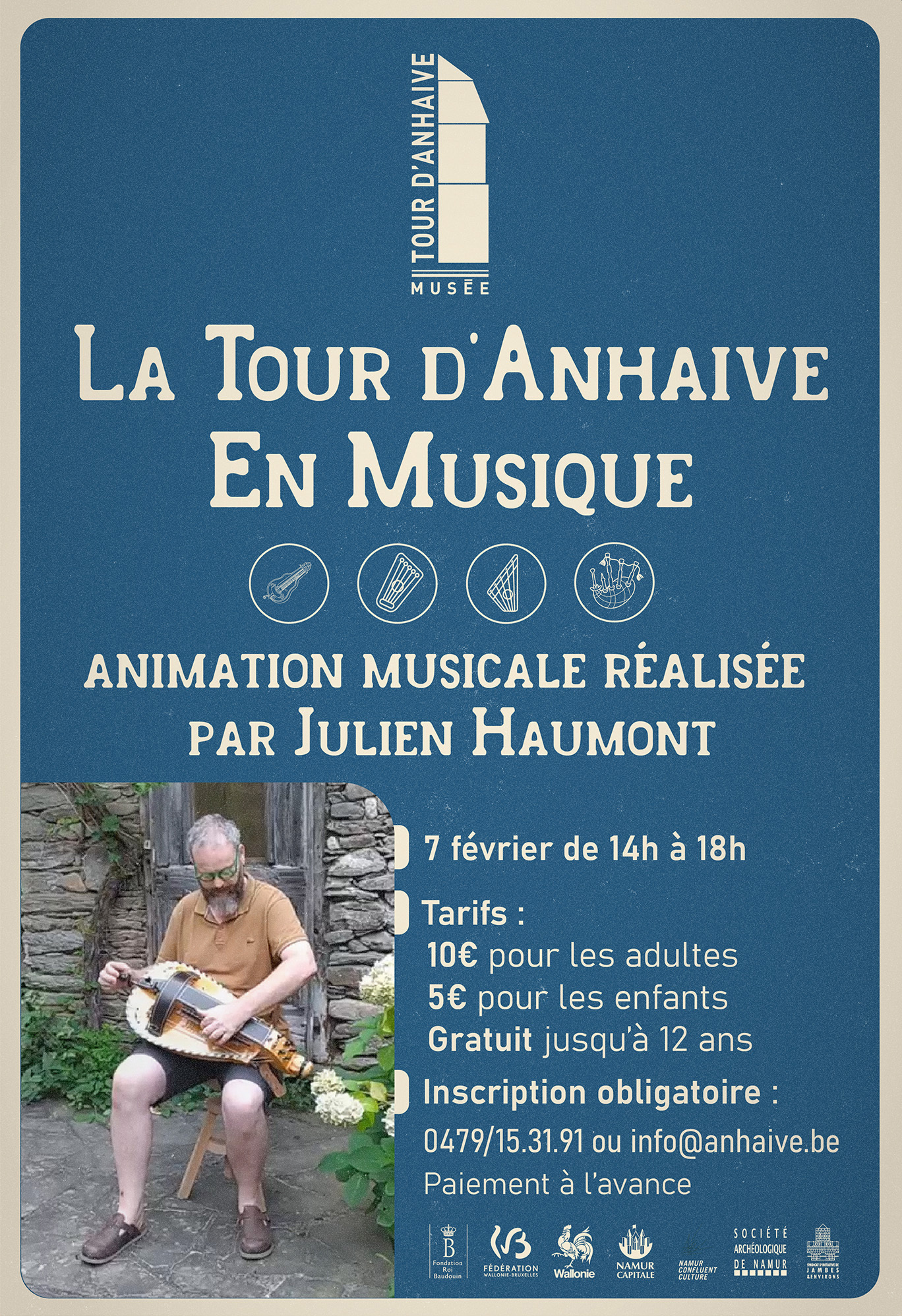 Une visite musicale de la Tour d’Anhaive vous attend le 7 février 2026 (de 14h à 18h). Le musicien Julien Haumont viendra jouer différents instruments anciens (vielle à roue, psaltérion, flûtes, cornemuse, harpe…) pour agrémenter votre visite et faire un bond dans le temps musical.