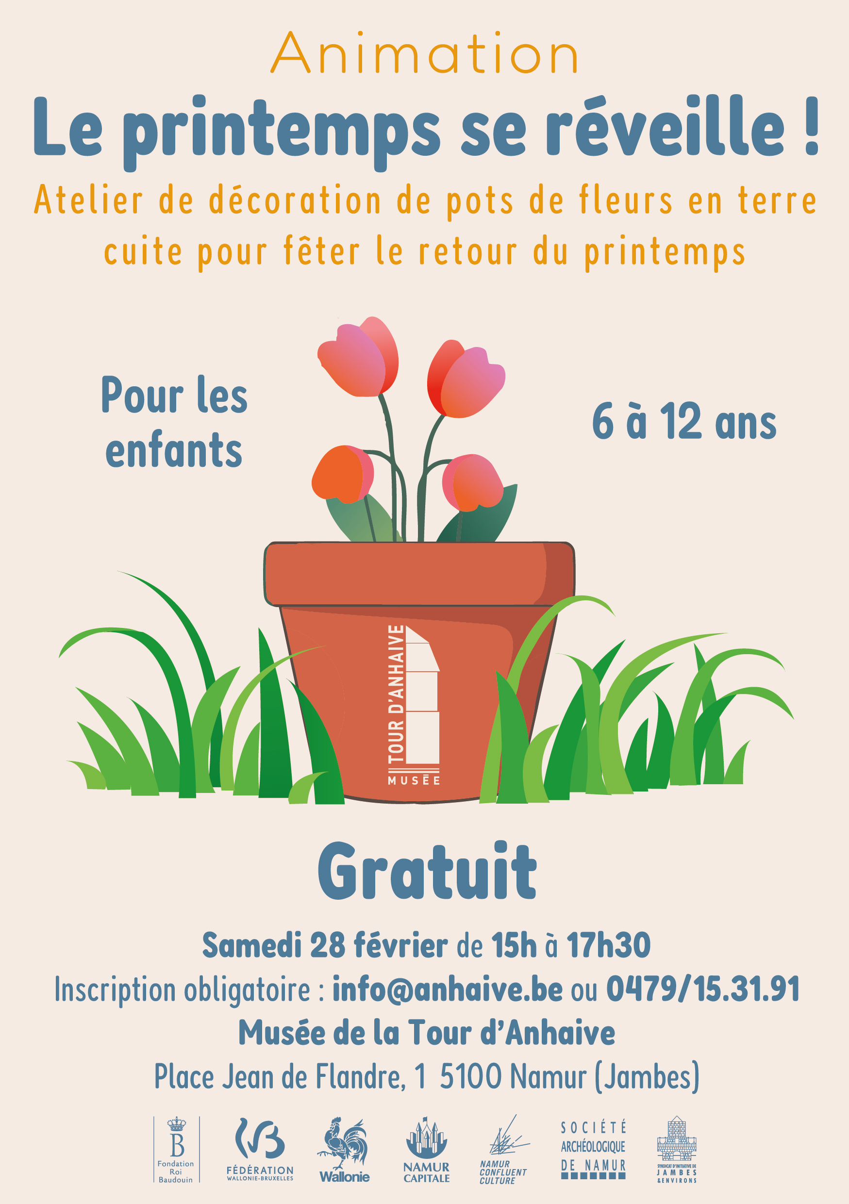 Afin de célébrer ce renouveau printanier, l’équipe du Musée de la Tour d’Anhaive invite les enfants de 6 à 12 ans à participer à un atelier créatif de décoration d’un pot de fleurs en terre cuite. Cette activité sera l’occasion d’observer les prémices du printemps tout en évoquant les vastes plaines agricoles qui caractérisaient autrefois le territoire jambois, avant l’urbanisation que nous connaissons aujourd’hui.